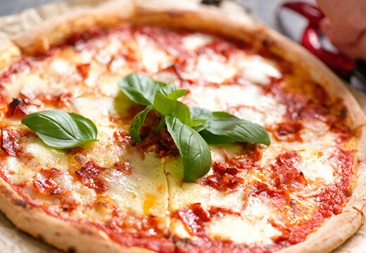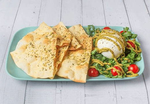 - Massa de pizza assada, mozzarella de búfala, rúcula e molho de pesto.